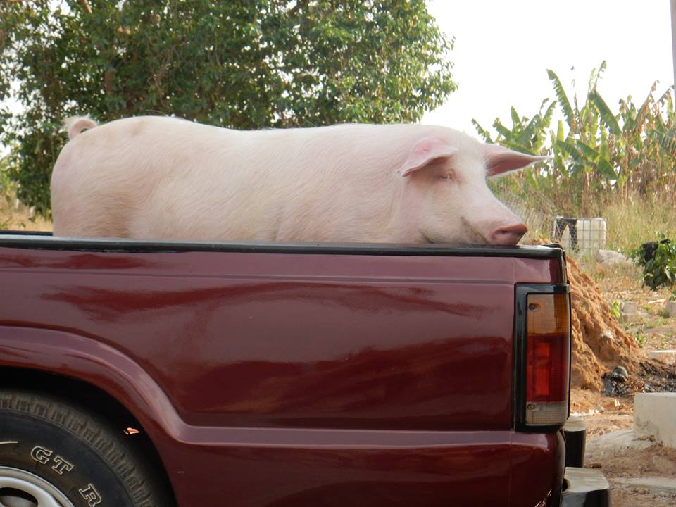 De boerderij als toekomstige bron van inkomsten heeft nu een capaciteit van 240 vleesvarkens. Hiervoor zijn twee ruime varkensschuren beschikbaar. Jaap licht toe: ‘de eerste 20 varkens zijn tijdens ons verblijf in februari verkocht. Zij waren 1 jaar en op het gewenste gewicht. Duidelijk was wel dat deze varkens niet blij waren met hun vertrek, want zij lieten dat goed horen’. De komende jaren wordt de boerderij langzaam uitgebreid naar 500 te verkopen varkens per jaar en er komt een complete kippenfarm met 6.000 legkippen. Hiervoor worden enkele medewerkers aangesteld. Op de eigen drie hectare grond wordt ook van alles verbouwd en geoogst, zoals: maïs, bonen, sla, aubergines, papaya’s en mango’s. Dit jaar zal wat extra landbouwgrond aangekocht kunnen worden voor de productie van maïs.